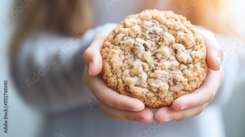Young person holding a large homemade cookie with chocolate chips in bright kitchen setting, showcasing a delicious dessert and cozy atmosphere