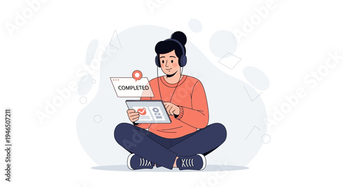 online, learning, task, completion, education, technology, digital, student, lifestyle, remote, work, e-learning, modern, tablet, user, earphones, wear, app, interface, checklist, graphic, success, concept, progress, indicator, minimalist, design, flat, illustration, young