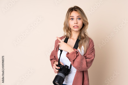 photographer, camera, photo, photo, photograph, professional, equipment, paparazzi, woman, people, person, female, young, adult, russian, isolated, background, teenage, teenage, youth, blond, pointing, side, finger, space, point, confident, signs, look, right, fear, panic, afraid, scared, frightened, panicked, nervous, shocked, stress, frustration, stressed, shock, anxiety