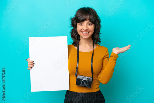 Young photographer latin woman isolated on blue background holding an empty placard with surprised expression