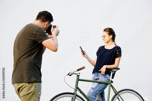 Young photographer taking photo of stylish pretty girl standing with bike and using a smartphone. Outdoors.