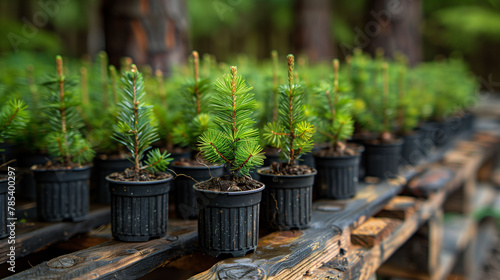 Young pine seedlings growing in black pots arranged on a wooden rack in a nursery, with a blurred forest background.