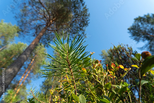 Young pine shoot in northern taiga forest, low angle view under blue sky