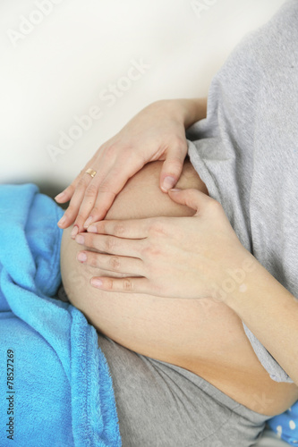 Young pregnant woman relaxing on sofa, close-up