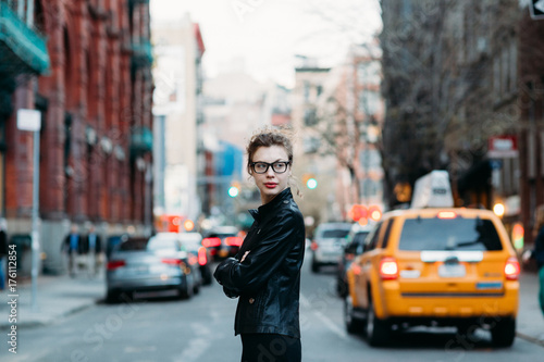 new york city, copy space, young, woman, walking, us, urban, taxi, stylish, style, street, scene, professional, profession, people, outside, outdoors, new york city, new york city, look, lipstick, lifestyle, life, leather, jacket, individuality, identity, goggles, freelance, cool, confidence, city, caucasian, car, businesswoman, business, beautiful, attractive, adult, girl, female, person, adult, 20s, grown-up