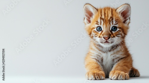 young saber toothed tiger cub sits against clean white background showcasing its soft spotted fur and developing fangs while its bright blue eyes reflect curiosity and playfulness.