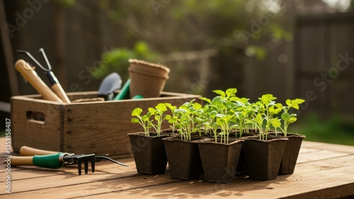 Young seedlings in planting trays on wooden table outdoors with gardening tools Focus on sustainability and nature