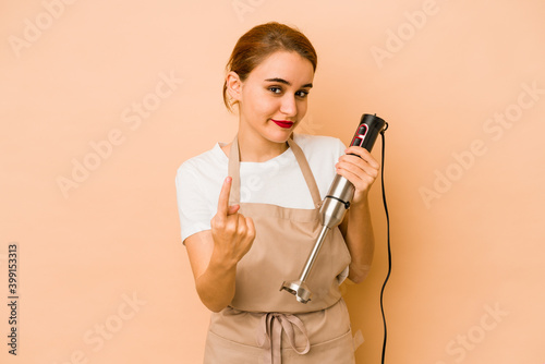 person, woman, food, girl, young, kitchen, blender, chef, mixer, studio, background, cook, cookery, ingredient, healthy, nourishment, female, portrait, home, uniform, beige, arab, muslim, isolated, service, shake, pretty, prepare, finger, positive, approach, arrive, move, advertising, calling, cheerful, emotional, emotional, expression, friendly, gesture, happy, inviting, pleasant, satisfied, welcoming, face, content