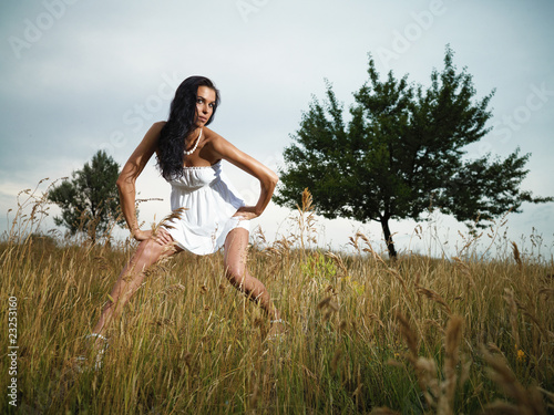girl, woman, beautiful, brunette, wood, grass, full-length, steppe, green, yellow, night, model, fashion, single, skinny, sky, hand, foot