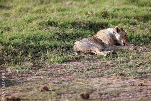 Young skinny lioness grooming itself while sitting on the grass in the Amboseli National Park, Kenya