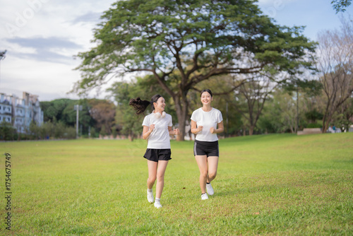 Young smiling Asian women jogging together across a lush green park, enjoying an energetic outdoor workout and healthy lifestyle in warm daylight with fresh air and friendship