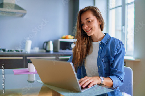 Young smiling attractive happy cute adult millennial girl freelancer remote working online on laptop at home
