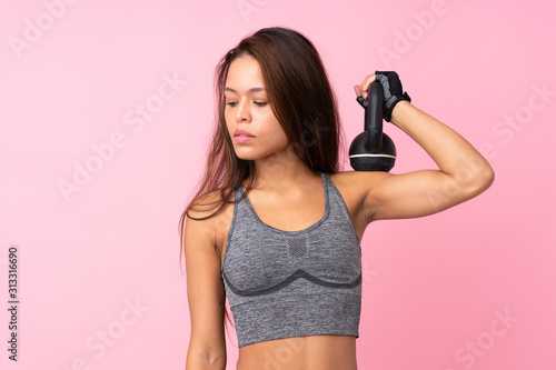 Young sport Brazilian girl over isolated pink background making weightlifting with kettlebell