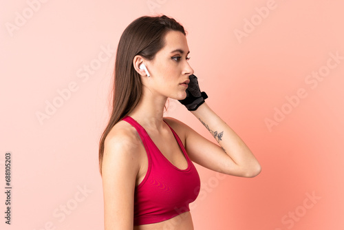 Young sport woman over isolated pink background listening music