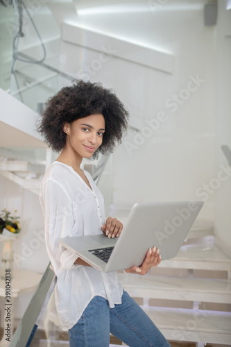 waist up, harmony, professional, happiness, successful, working, positive, light, white, blouse, look, coiffure, face, modern, stylish, style, railing, leaning, beauty, slim, standing, posture, well-being, interior, casual attire, woman, stair, lifestyle, young, joyful, special, beautiful, impression, step, girl, laptop
