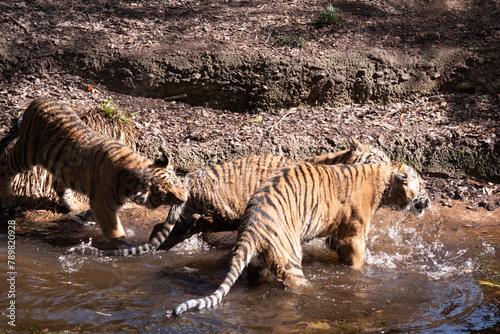 Young tigers have a coat of golden fur with dark stripes, the tiger is the largest wild cat in the world. Tigers are powerful hunters with sharp teeth, strong jaws and agile bodies.