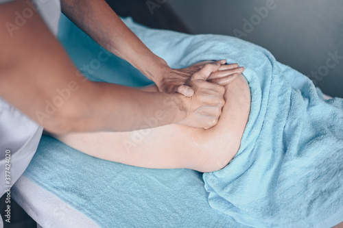 Young unrecognizable woman lying on massage table and enjoying therapeutic massage. Body care, losing weight concept. Hands masseur massage therapist doing anti-cellulite massage in spa clinic.