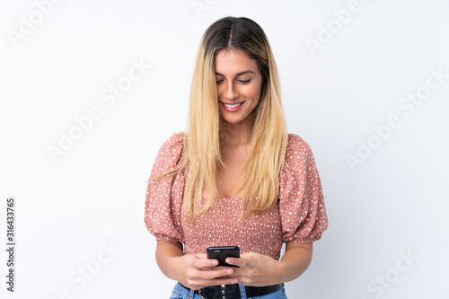 Young Uruguayan woman over isolated white background sending a message with the mobile