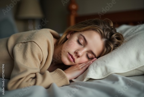 Young Woman Asleep on Pillow in Beige Sweater
