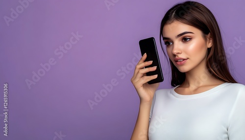 Young woman chatting on her smartphone with a focused expression on a solid purple background.