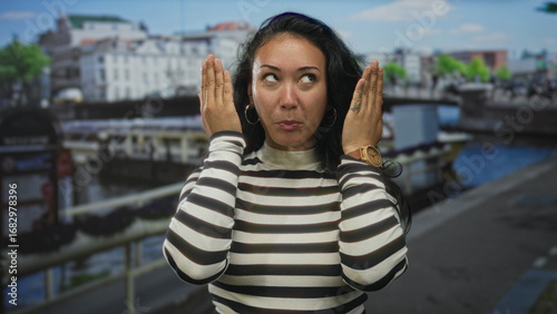 woman, hand, covering, street, young, amsterdam, canal, female, travel, holiday maker, playful, surprise, fun, joy, amusement, silly, expression, reaction, mischievous, cheerful, water, boat, bridge, building, tattoo, watch, earring, stripes, black, white, gesture, tongue, pose, natural, pavement, urban, wooden, downtown, accessory, hoop, playfulness, mock, mimic, daytime, jewellery, foreground, laughter, brash, spontaneous