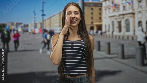 woman, face, calling, street, girl, teenage, piazza, pedestrian, tank top, playful, smile, laughter, expression, gesture, shouting, public, holiday maker, bollard, building, youth, jean, casual attire, hair, leisure, candid, flag, people, striped, denim, speaking, vocal, brunette, youthful, attention, communication, caller, call, shout, voice, travel, sightseeing, grin, interaction, atmosphere, recreation, announcement, address, posing