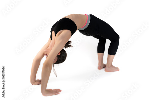 Young woman doing yoga practice isolated on white background. Flexible fit female body. Horizontal shot. High resolution sharp photo.
