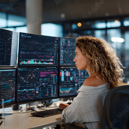 Young Woman Engaged in Data Analysis with Multiple Computer Screens
