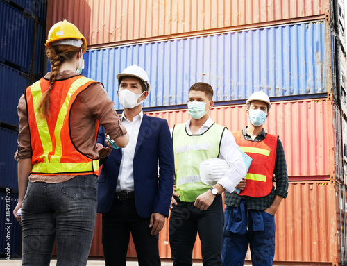 Young woman engineers standing in the shipping yard tracking the cargo inventory and checking container box for safety.