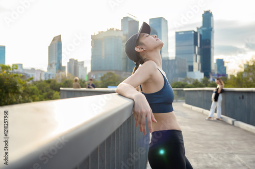 asian woman, young, woman, urban, park, exercise, fitness, outdoors, sunny, day, city, skyline, relaxation, greenery, health, lifestyle, standing, rail, smiling, cap, sport, bra, activewear, nature, afternoon, leisure, activity, physical, walking, healthy, living, sporty, environment, beauty, vitality, enjoyment, landscape, scenic, portrait, confidence, joy, well-being, fresh, air, view, sunshine, peaceful, calm
