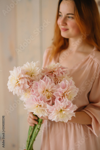 young woman florist in a pink dress with red hair holds a wedding bouquet of flowers roses