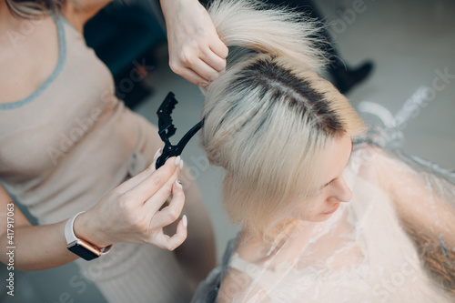Young woman hairdresser with pin dying hair at beauty salon. Professional hair roots coloring