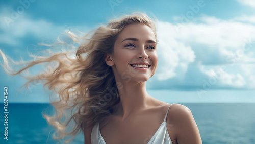 Young woman in a light silk dress, smiling against the backdrop of a light blue sea, waves and sky with clouds. Lightness and airiness.