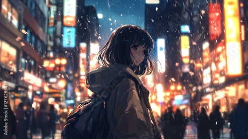 nightlife, serenity, dreamy, quiet, solitude, mood, exploration, neon, atmosphere, fantasy, glow, light, photo, emotion, journey, dusk, colours, snowfall, scene, chilly, lense, people, night, coat, dreamlike, portrait, light, woman, art, modern, urban, backpack, aesthetic, beauty, casual attire, adventure, cold, city landscape, winter, street, city, urbanity, wintery