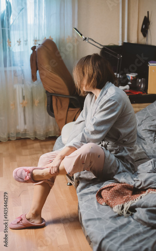 Young woman in gray bathrobe and pink slippers sitting on bed edge in morning routine.
