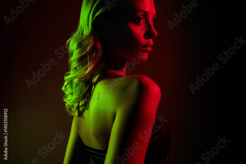 female, neon, red, green, young, beauty, style, fashion, make-up, visage, luxury, model, tempting, sensual, passionate, lady, sexy, girl, body, gentle, stunning, naked, shoulder, beautiful, attractive, blond, hair, holiday, wealthy, night, club, disco, party, elegance, skin, care, salon, procedure, dark, background, glamour, light, colours, attraction, allure, sophistication, cosmetology, cosmetic, woman, black
