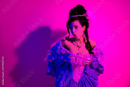 Young woman in period costume illuminated by vibrant pink and purple neon lighting