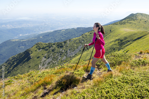 Young woman in pink trekking in the mountain