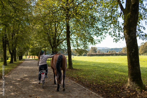 horse, equine, woman, young adult, walking, path, tree, nature, sunny day, greenfield, countryside, equestrian, animal, brown horse, pasture, grass, rural, landscape, calm, leisure, equestrianism, half face, natural light, summer, no people, country road, agriculture, farming, recreation, avocation, peaceful, trail