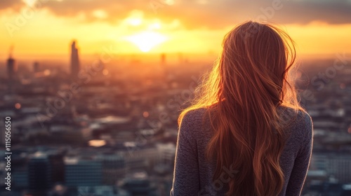 Young woman looking over the City of London at sunset. Beautiful city background in gentle light. Future, freedom, business success and new opportunity concept
