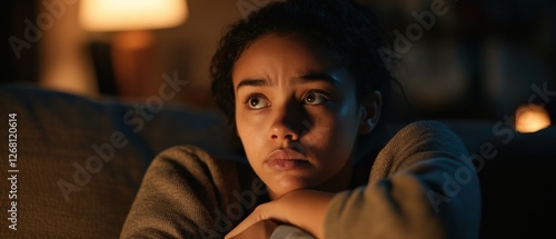 woman, young adult, pensive, indoor, night, dark, thinking, worry, anxiety, concern, serious, portrait, moody, low light, contemplative, couch, resting, soft light, melancholy, calm, lonely, brunette, female, looking up, closeup