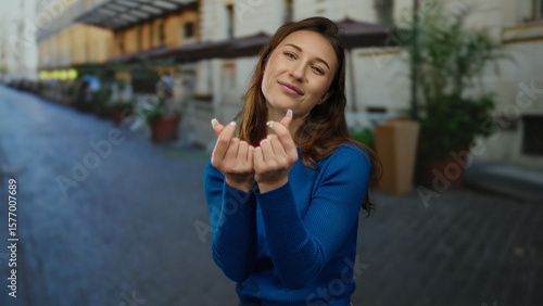 woman, young, nubes, gesture, finger, smiling, street, city, urban, happy, caucasian, blue, sweater, casual attire, daylight, expression, natural, background, building, pavement, public, friendly, interaction, culture, lifestyle, positive, modern, female, energy, connected, agile, active, authentic, selfie, symbol, hand, charming, europa, relaxed, engaged, carefree, posing, innocent, delight, fashionable, youthful, care, look