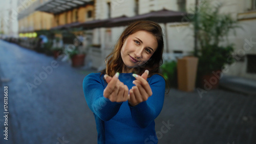 woman, young, nubes, gesture, finger, smiling, street, city, urban, happy, caucasian, blue, sweater, casual attire, daylight, expression, natural, background, building, pavement, public, friendly, interaction, culture, lifestyle, positive, modern, female, energy, connected, agile, active, authentic, selfie, symbol, hand, charming, europa, relaxed, engaged, carefree, posing, innocent, delight, fashionable, youthful, care, look