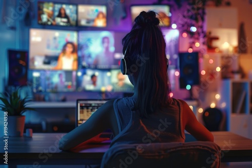Young woman multitasking with multiple screens, wearing headphones for focus and comfort.