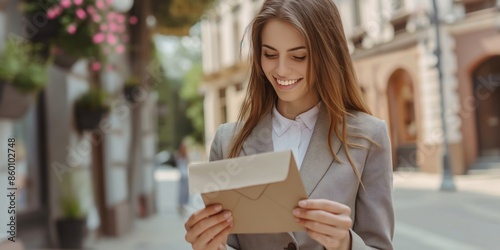 Young woman on the street happily holding an envelope