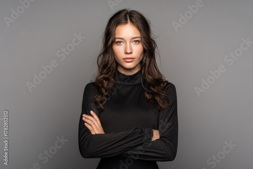 woman, pose, confidence, studio, indoor, grey background, portrait, arms crossed, expression, youthful, beauty, serene, fashion, closeup, modelling, coiffure, make-up, elegance, personality, simplicity, style, contemporary, attitude, self-assured, aesthetic, facial features, natural beauty, body language, copy space