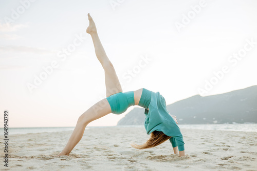 Young woman practicing yoga on the beach at sunrise, performing advanced backbend pose (Urdhva Dhanurasana). Outdoor workout by the ocean for strength, flexibility, and mindfulness