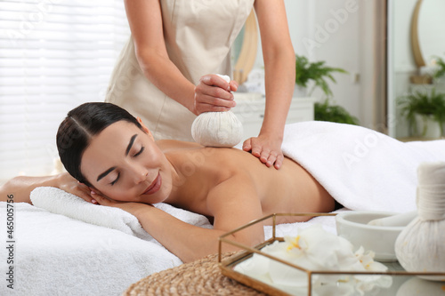 Young woman receiving herbal bag massage in spa salon