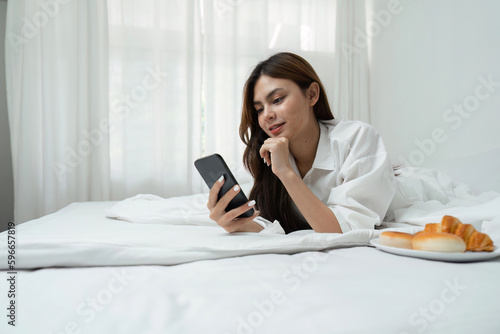 Young woman relaxing and eat bread using telephone on checking social apps and working the bedroom
