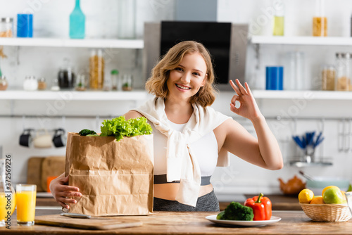young woman showing ok sign near paper bag with lettuce and bowl with fruits